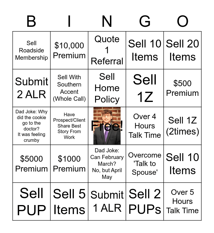 This bingo card has a free space and 24 words: $1000 Premium, Sell 5 Items, Sell Home Policy, Sell PUP, Sell 20 Items, Sell Roadside Membership, Submit 2 ALR, $10,000 Premium, Over 4 Hours Talk Time, Dad Joke: Can February March? No, but April May, Sell 1Z, Dad Joke: Why did the cookie go to the doctor? It was feeling crumby, Overcome 'Talk to Spouse', Sell 10 Items, Sell With Southern Accent (Whole Call), Sell 2 PUPs, Sell 1Z (2times), Quote 1 Referral, $500 Premium, Have Prospect/Client Share Best Story From Work, Over 5 Hours Talk Time, $5000 Premium, Sell 10 Items and Submit 1 ALR.