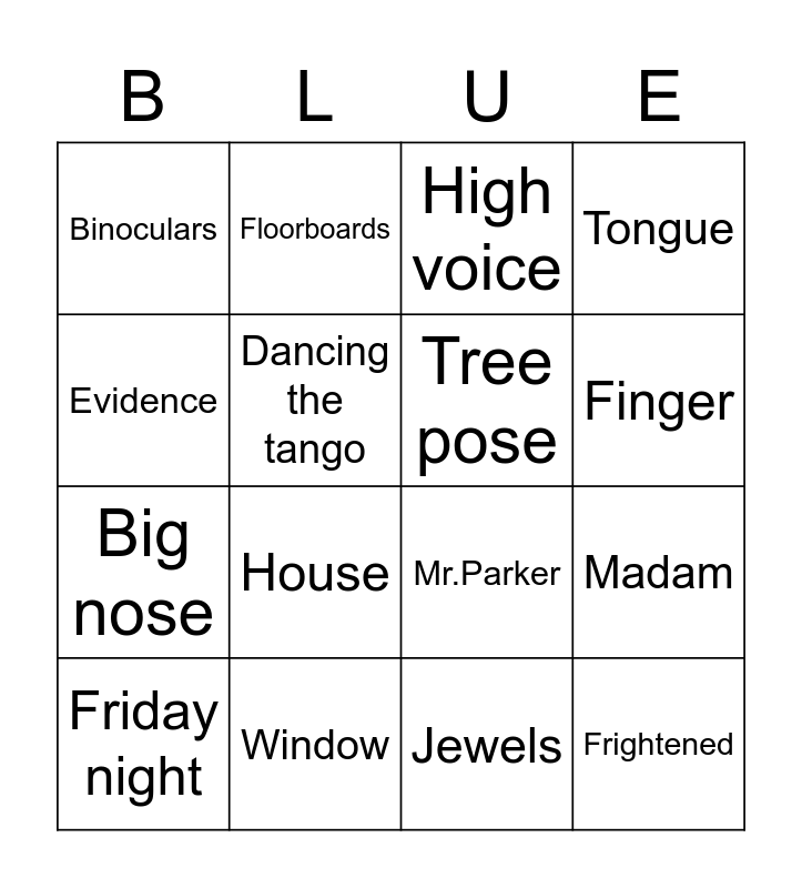 This bingo card has 16 words: Window, Madam, High voice, Binoculars, Big nose, Floorboards, Mr.Parker, Jewels, Evidence, Dancing the tango, Friday night, Tongue, House, Finger, Tree pose and Frightened.