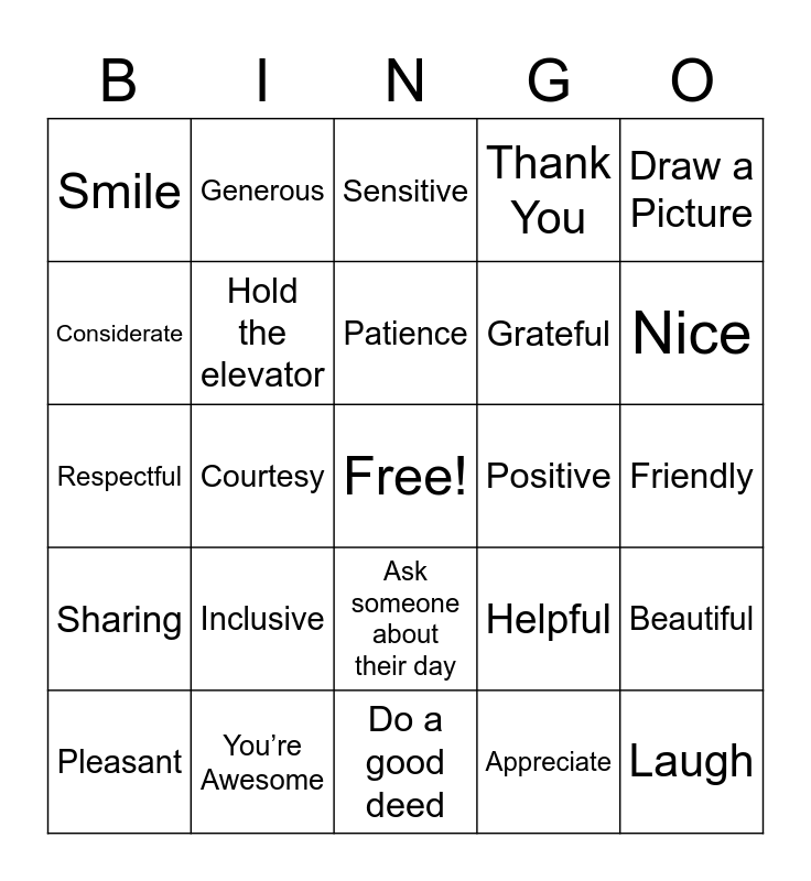 This bingo card has a free space and 58 words: Kindness, You’re Awesome, Caring, Sharing, Appreciate, Helping Hands, Hold the elevator, Hugs, Grateful, Great Humor, Thank You, Great Listener, You’re the Best, You Make a Difference, Give a Compliment, Smile, Laugh, Draw a Picture, Sing a Song, Patience, Positive, Sensitive, Pleasant, Beautiful, Gentle, Friendly, Sympathy, Peaceful, Nice, Flowers, Volunteer, Call a friend, Write a kind note, Pay it forward, Empathy, Gratitude, Say good morning to someone, Courtesy, Respectful, Thankful, Inclusive, Supportive, Helpful, High-five, Make someone laugh, Cheer someone up, Donate, Ask someone about their day, Do a good deed, Encourage others, Do a random act of kindness, Hold the door, Community service, Selfless, Generous, Thoughtful, Considerate and Charitable.