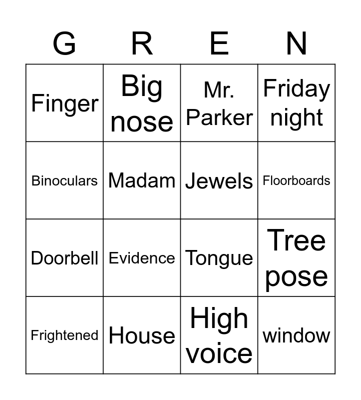 This bingo card has 16 words: House, Tree pose, Mr. Parker, Finger, Doorbell, Big nose, Tongue, High voice, Binoculars, Madam, Frightened, Friday night, Evidence, Floorboards, Jewels and window.