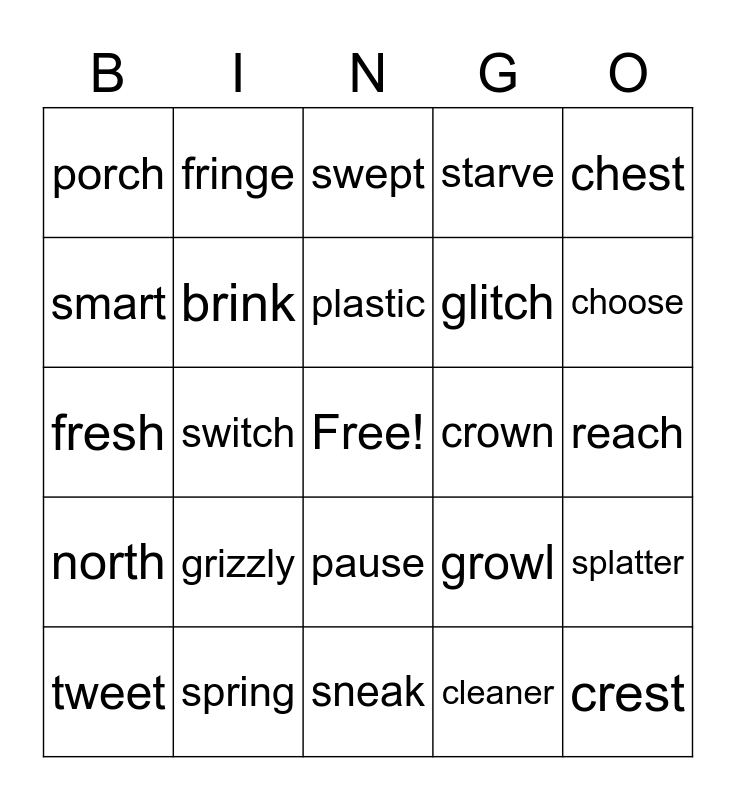This bingo card has a free space and 24 words: grizzly, spring, plastic, tweet, chest, porch, smart, fringe, crown, pause, glitch, fresh, growl, splatter, brink, cleaner, reach, swept, choose, switch, crest, north, starve and sneak.