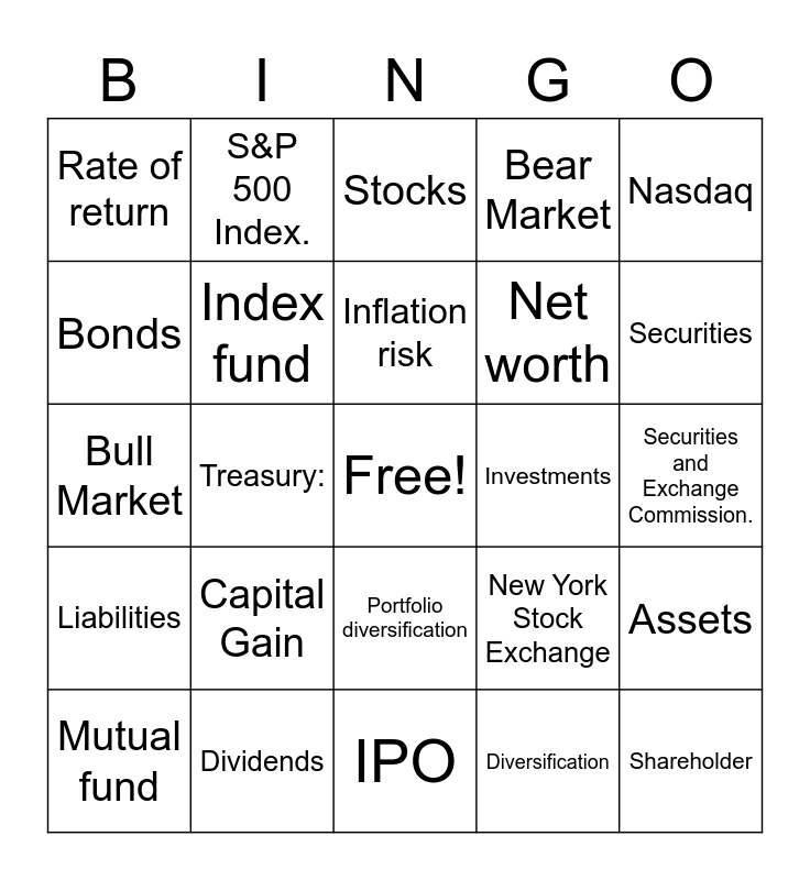 This bingo card has a free space and 28 words: Assets, Dividends, Net worth, Diversification, Bonds, Stocks, S&P 500 Index., Liabilities, Investments, Mutual fund, Bull Market, Bear Market, Dividends, IPO, Securities, Brokerage firm, Capital Gain, Index fund, Inflation risk, Portfolio diversification, Rate of return, Speculative investments, Shareholder, Treasury:, Securities and Exchange Commission., New York Stock Exchange, Nasdaq and Securities.