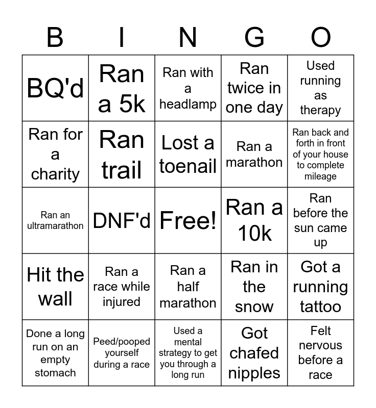 This bingo card has a free space and 24 words: Ran a race while injured, Peed/pooped yourself during a race, Lost a toenail, Done a long run on an empty stomach, Used running as therapy, BQ'd, Ran for a charity, Ran a 5k, Ran a 10k, Ran a half marathon, Ran a marathon, Ran an ultramarathon, Ran in the snow, Got a running tattoo, Ran trail, Got chafed nipples, Ran before the sun came up, Ran with a headlamp, Ran back and forth in front of your house to complete mileage, DNF'd, Felt nervous before a race, Hit the wall, Ran twice in one day and Used a mental strategy to get you through a long run.