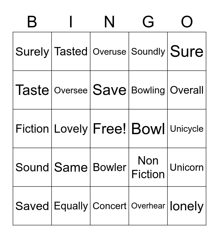 This bingo card has a free space and 24 words: Same, Equally, Save, Saved, Sure, Surely, Taste, Tasted, Bowl, Bowler, Bowling, Fiction, Non Fiction, Unicorn, Oversee, Overhear, Unicycle, Overuse, Overall, Lovely, lonely, Sound, Soundly and Concert.