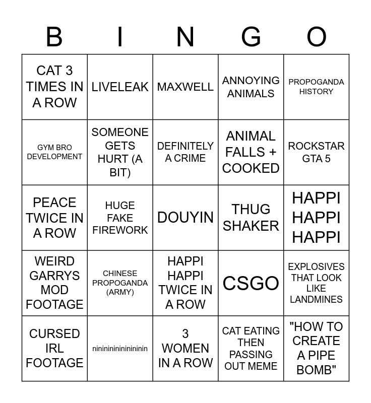 This bingo card has a free space and 24 words: CHINESE PROPOGANDA (ARMY), nininininininininin, DEFINITELY A CRIME, CURSED IRL FOOTAGE, PROPOGANDA HISTORY, CAT 3 TIMES IN A ROW, GYM BRO DEVELOPMENT, LIVELEAK, THUG SHAKER, HAPPI HAPPI TWICE IN A ROW, ANIMAL FALLS + COOKED, PEACE TWICE IN A ROW, CSGO, EXPLOSIVES THAT LOOK LIKE LANDMINES, SOMEONE GETS HURT (A BIT), CAT EATING THEN PASSING OUT MEME, HAPPI HAPPI HAPPI, MAXWELL, ROCKSTAR GTA 5, HUGE FAKE FIREWORK, "HOW TO CREATE A PIPE BOMB", WEIRD GARRYS MOD FOOTAGE, ANNOYING ANIMALS and 3 WOMEN IN A ROW.