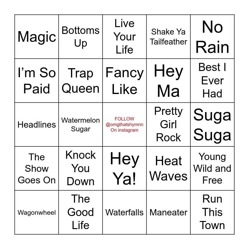 This bingo card has a free space and 34 words: Bedrock, Maneater, SOS, Lump, The Show Goes On, Trap Queen, No Rain, Wagonwheel, Bottoms Up, Country Grammer, Fancy Like, Live Your Life, Buy You a Drank, Cheers, Pretty Girl Rock, Best I Ever Had, The Good Life, Headlines, Knock You Down, Heat Waves, Hey Ya!, Big Poppa, Magic, Suga Suga, Waterfalls, Run This Town, Shake Ya Tailfeather, Get Ya Freak On, Hey Ma, Iโm So Paid, Work Out, Watermelon Sugar, Young Wild and Free and Billionaire.
