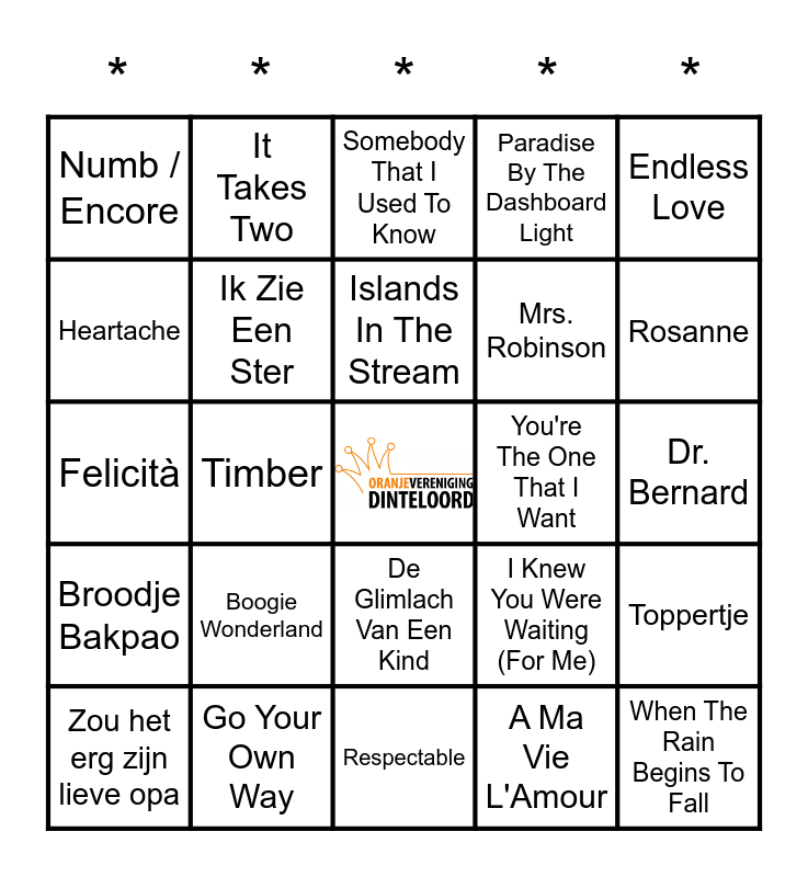This bingo card has a free space and 79 words: The Look, Superman, Somebody That I Used To Know, Sisters Are Doin' It for Themselves, M'n Opa, Little Man, Last Christmas, Kids, Just Give Me A Reason, Blurred Lines, Proud Mary, Pastorale, Paradise By The Dashboard Light, Numb / Encore, Hoe, Heartache, Goud, Boogie Wonderland, Don't Leave Me This Way, Dr. Bernard, Empire State Of Mind, Endless Love, Felicità, Islands In The Stream, Ik Zie Een Ster, When Love comes To Town, We Zijn Samen Sterk, We Are The World, Walk This Way, Scream & Shout, Rosanne, Rio, Respectable, Blijven Slapen, Zou het erg zijn lieve opa, You're The One That I Want, Your Smile, Wonderful Days, When You're Gone, When The Rain Begins To Fall, Alles Kan Een Mens Gelukkig Maken, Als Het Om de Liefde Gaat, Als je wint heb je vrienden, Bad Memories, Barbie Girl, It Takes Two, It Ain't What You D It's The Way That You Do It, Do They Know It's Christmas?, De Spaanse Zon, Bon Gepakt, Toppertje, Timber, I Knew You Were Waiting (For Me), Gimme Gimme Gimme, Frans Duits, I Got You Babe, Holiday Rap, Shallow, Senza Una Donna, De Glimlach Van Een Kind, Mrs. Robinson, Zoutelande, Je t'aime moi non plus, Frankfurt Oder, De Regenboog, I Gotta Feeling, De Eerste Keer, Dancing In The Street, Crazy In Love, Broodje Bakpao, Go Your Own Way, Vluchten Kan Niet Meer, Verzonken Stad, Under Pressure, (I've had) The Time Of My Life, A Ma Vie L'Amour, Alle Duiven Op De Dam, Ik lig op m'n kussen stil te dromen and I Trenzi Di Tozeur.