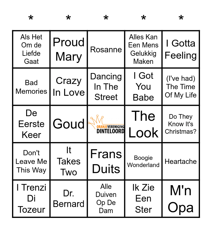 This bingo card has a free space and 79 words: Walk This Way, Scream & Shout, Rosanne, Rio, Respectable, Blijven Slapen, Zou het erg zijn lieve opa, You're The One That I Want, Your Smile, Wonderful Days, When You're Gone, When The Rain Begins To Fall, Alles Kan Een Mens Gelukkig Maken, Als Het Om de Liefde Gaat, Als je wint heb je vrienden, Bad Memories, Barbie Girl, It Takes Two, It Ain't What You D It's The Way That You Do It, Do They Know It's Christmas?, De Regenboog, I Gotta Feeling, De Eerste Keer, Dancing In The Street, Crazy In Love, Broodje Bakpao, Go Your Own Way, Vluchten Kan Niet Meer, Verzonken Stad, Under Pressure, (I've had) The Time Of My Life, A Ma Vie L'Amour, Alle Duiven Op De Dam, Ik lig op m'n kussen stil te dromen, I Trenzi Di Tozeur, The Look, Superman, Somebody That I Used To Know, Sisters Are Doin' It for Themselves, M'n Opa, Little Man, Last Christmas, Kids, Just Give Me A Reason, Blurred Lines, Proud Mary, Pastorale, Paradise By The Dashboard Light, Numb / Encore, Hoe, Heartache, Goud, Boogie Wonderland, De Spaanse Zon, Bon Gepakt, Toppertje, Timber, I Knew You Were Waiting (For Me), Gimme Gimme Gimme, Frans Duits, I Got You Babe, Holiday Rap, Shallow, Senza Una Donna, De Glimlach Van Een Kind, Mrs. Robinson, Zoutelande, Je t'aime moi non plus, Frankfurt Oder, Don't Leave Me This Way, Dr. Bernard, Empire State Of Mind, Endless Love, Felicità, Islands In The Stream, Ik Zie Een Ster, When Love comes To Town, We Zijn Samen Sterk and We Are The World.