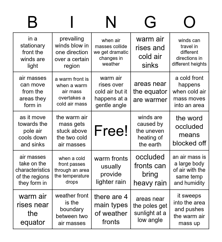 This bingo card has a free space and 28 words: an air mass is a large body of air with the same temp and humidity, air masses can be cool, warm, humid, or dry, areas near the equator are warmer, areas near the poles get sunlight at a low angle, air masses can move from the areas they form in, when air masses collide we get dramatic changes in weather, prevailing winds blow in one direction over a certain region, air masses take on the characteristics of the regions they form in, winds are caused by the uneven heating of the earth, warm air rises near the equator, as it move towards the pole air cools down and sinks, warm air rises and cold air sinks, weather front is the boundary between two air masses, there are 4 main types of weather fronts, a cold front happens when cold air mass moves into an area, because the boundary at a cold front is so steep big clouds can form, when a cold front passes through an area the temperature drops, a warm front is when a warm air mass overtakes a cold air mass, warm air rises over cold air but it happens at a gentle angle, warm fronts usually provide lighter rain, in a stationary front the winds are light, an occluded front forms when an air mass becomes separated, it sweeps into the area and pushes the warm air mass up, the warm air mass gets stuck above the two cold air masses, the word occluded means blocked off, occluded fronts can bring heavy rain, winds can travel in different directions in different heights and scientists predict the weather using probability.