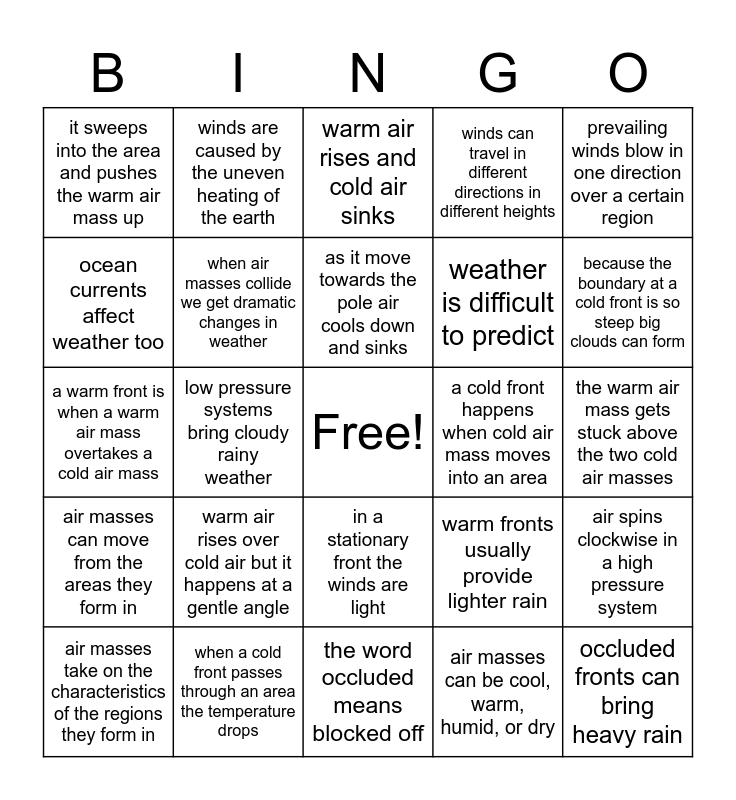 This bingo card has a free space and 34 words: an air mass is a large body of air with the same temp and humidity, air masses can be cool, warm, humid, or dry, areas near the equator are warmer, areas near the poles get sunlight at a low angle, air masses can move from the areas they form in, when air masses collide we get dramatic changes in weather, prevailing winds blow in one direction over a certain region, air masses take on the characteristics of the regions they form in, winds are caused by the uneven heating of the earth, warm air rises near the equator, as it move towards the pole air cools down and sinks, warm air rises and cold air sinks, weather front is the boundary between two air masses, there are 4 main types of weather fronts, a cold front happens when cold air mass moves into an area, because the boundary at a cold front is so steep big clouds can form, when a cold front passes through an area the temperature drops, a warm front is when a warm air mass overtakes a cold air mass, warm air rises over cold air but it happens at a gentle angle, warm fronts usually provide lighter rain, in a stationary front the winds are light, an occluded front forms when an air mass becomes separated, it sweeps into the area and pushes the warm air mass up, the warm air mass gets stuck above the two cold air masses, the word occluded means blocked off, occluded fronts can bring heavy rain, winds can travel in different directions in different heights, scientists predict the weather using probability, weather is difficult to predict, ocean currents affect weather too, high pressure systems bring clear sunny weather, low pressure systems bring cloudy rainy weather, air spins clockwise in a high pressure system and air spins counterclockwise in a low pressure system.