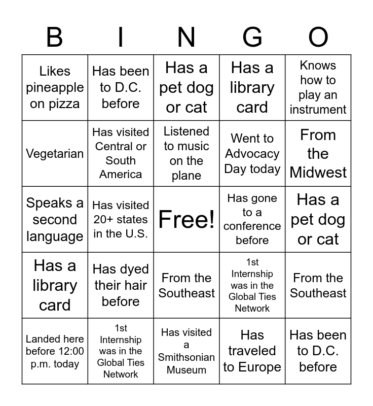 ⚠ This card has duplicate items: From the Midwest (2), Has been to D.C. before (2), Between 5’3” and 5’7” (2), Landed here before 12:00 p.m. today (2), Likes pineapple on pizza (2), Has traveled to Europe (2), Has a pet dog or cat (2), Owns an air fryer (2), Knows how to play an instrument (2), 1st Internship was in the Global Ties Network (2), Has a library card (2), Has gone to a conference before (2), From the Southeast (2), Has dyed their hair before (2), Has visited 20+ states in the U.S. (2), Has visited a Smithsonian Museum (2), Has seen cherry blossoms in-person (2), Speaks a second language (2), Listened to music on the plane (2)