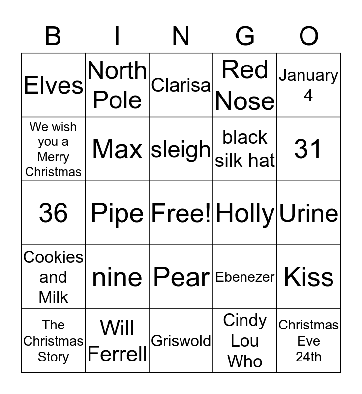 This bingo card has a free space and 24 words: nine, Will Ferrell, sleigh, The Christmas Story, January 4, Elves, We wish you a Merry Christmas, North Pole, Holly, Pear, black silk hat, 36, Ebenezer, Kiss, Max, Cindy Lou Who, Urine, Clarisa, 31, Pipe, Christmas Eve 24th, Cookies and Milk, Red Nose and Griswold.