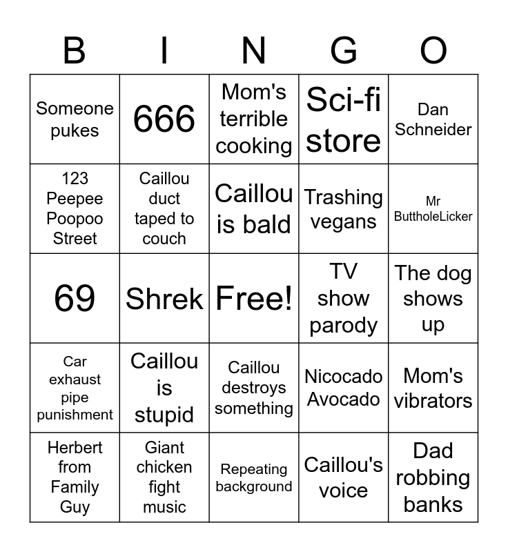 This bingo card has a free space and 42 words: Caillou is ugly, Caillou is bald, Caillou smells, Caillou is stupid, Caillou's voice, Mom's vibrators, Dad robbing banks, Grandma's peppermint, Mom's terrible cooking, Caillou destroys something, The dog shows up, Mr ButtholeLicker, Shrek, Dan Schneider, Mr Beast, Nicocado Avocado, Miley Cyrus, 69, 420, 666, 123 Peepee Poopoo Street, Spongebob “X Hours Later”, Someone pooping, Someone pukes, Inflation, Trashing electric cars, Trashing vegans, “Subscribe to Jeffincats”, 30-second rant, Breaking 4th wall, Cheese grater punishment, Car exhaust pipe punishment, Caillou duct taped to couch, Repeating background, Pink Panther music, Herbert from Family Guy, Giant chicken fight music, TV show parody, Caillou's classmate speaks, Cool special effects, Sci-fi store and Reference to previous episode.