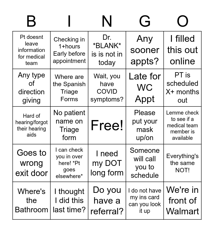 This bingo card has a free space and 24 words: Where's the Bathroom, I can check you in over here! *Pt goes elsewhere*, Wait, you have COVID symptoms?, I do not have my ins card can you look it up, I filled this out online, Pt doesnt leave information for medical team, Checking in 1+hours Early before appointment, Dr. *BLANK* is is not in today, Please put your mask up/on, Lemme check to see if a medical team member is available, Hard of hearing/forgot their hearing aids, Where are the Spanish Triage Forms, Someone will call you to schedule, Everything's the same NOT!, Any type of direction giving, I thought I did this last time?, Do you have a referral?, Any sooner appts?, PT is scheduled X+ months out, Goes to wrong exit door, No patient name on Triage form, I need my DOT long form, Late for WC Appt and We're in front of Walmart.