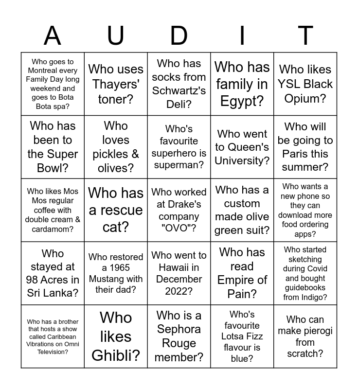 This bingo card has 25 words: Who restored a 1965 Mustang with their dad?, Who is a Sephora Rouge member?, Who's favourite superhero is superman?, Who has a brother that hosts a show called Caribbean Vibrations on Omni Television?, Who likes YSL Black Opium?, Who goes to Montreal every Family Day long weekend and goes to Bota Bota spa?, Who has been to the Super Bowl?, Who uses Thayers' toner?, Who has a custom made olive green suit?, Who went to Hawaii in December 2022?, Who went to Queen's University?, Who likes Mos Mos regular coffee with double cream & cardamom?, Who has read Empire of Pain?, Who started sketching during Covid and bought guidebooks from Indigo?, Who loves pickles & olives?, Who can make pierogi from scratch?, Who wants a new phone so they can download more food ordering apps?, Who has socks from Schwartz's Deli?, Who will be going to Paris this summer?, Who has a rescue cat?, Who worked at Drake's company "OVO"?, Who likes Ghibli?, Who stayed at 98 Acres in Sri Lanka?, Who has family in Egypt? and Who's favourite Lotsa Fizz flavour is blue?.