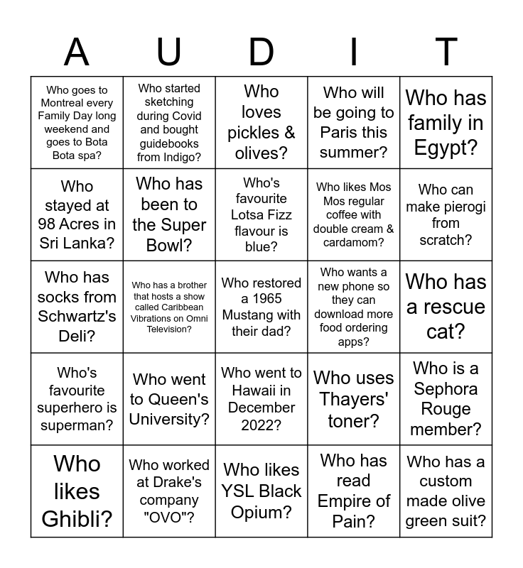 This bingo card has a free space and 24 words: Who went to Queen's University?, Who worked at Drake's company "OVO"?, Who's favourite Lotsa Fizz flavour is blue?, Who likes Ghibli?, Who has family in Egypt?, Who goes to Montreal every Family Day long weekend and goes to Bota Bota spa?, Who stayed at 98 Acres in Sri Lanka?, Who started sketching during Covid and bought guidebooks from Indigo?, Who wants a new phone so they can download more food ordering apps?, Who went to Hawaii in December 2022?, Who likes Mos Mos regular coffee with double cream & cardamom?, Who has socks from Schwartz's Deli?, Who uses Thayers' toner?, Who is a Sephora Rouge member?, Who has been to the Super Bowl?, Who has read Empire of Pain?, Who has a rescue cat?, Who loves pickles & olives?, Who can make pierogi from scratch?, Who has a brother that hosts a show called Caribbean Vibrations on Omni Television?, Who has a custom made olive green suit?, Who's favourite superhero is superman?, Who will be going to Paris this summer? and Who likes YSL Black Opium?.