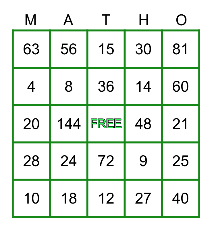 This bingo card has a free space and 24 words: 24, 18, 36, 10, 81, 63, 4, 56, 48, 72, 14, 20, 9, 25, 8, 27, 21, 15, 60, 144, 40, 28, 30 and 12.