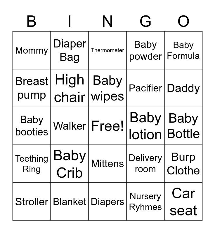 This bingo card has a free space and 24 words: Baby Crib, Blanket, Baby wipes, Stroller, Baby Formula, Mommy, Breast pump, Diaper Bag, Baby lotion, Mittens, Pacifier, Baby booties, Delivery room, Burp Clothe, High chair, Nursery Ryhmes, Baby Bottle, Thermometer, Daddy, Walker, Car seat, Teething Ring, Baby powder and Diapers.
