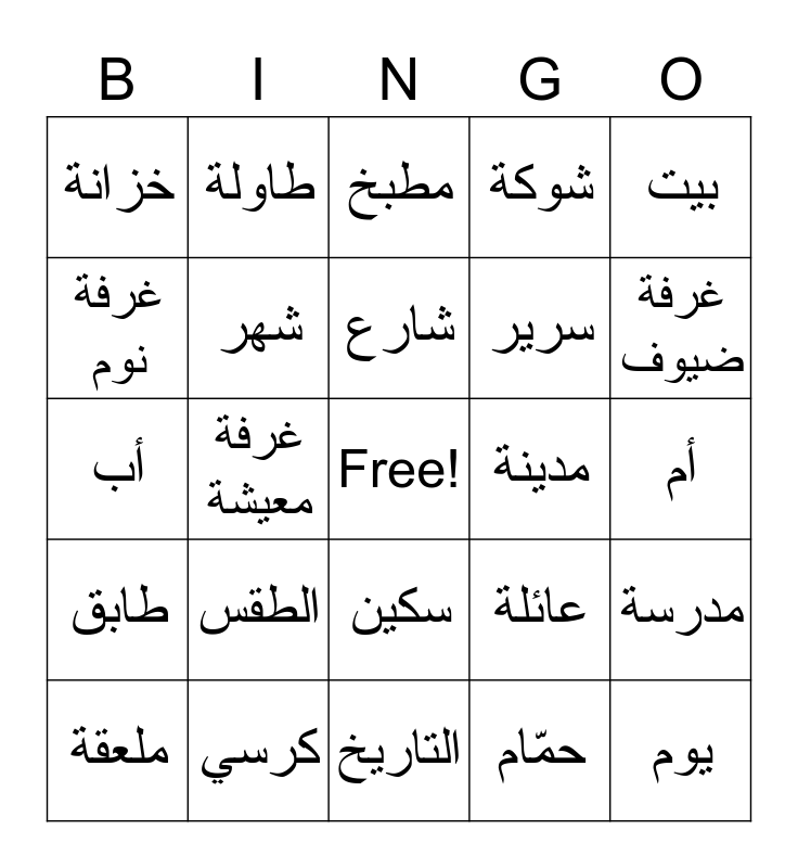 This bingo card has a free space and 24 words: الطقس, كرسي, شارع, ملعقة, بيت, خزانة, غرفة نوم, طاولة, مدينة, سكين, سرير, أب, عائلة, مدرسة, شهر, حمّام, أم, مطبخ, غرفة ضيوف, غرفة معيشة, يوم, طابق, شوكة and التاريخ.