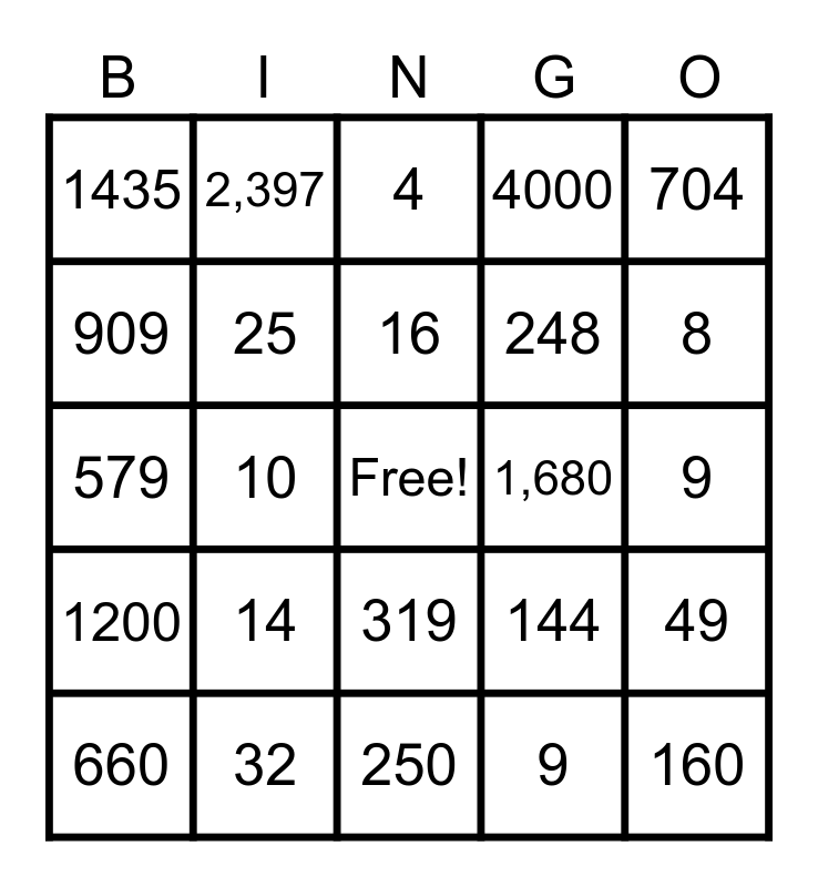 This bingo card has a free space and 24 words: 14, 32, 16, 660, 704, 1435, 909, 2,397, 1,680, 319, 248, 579, 144, 49, 25, 9, 9, 4, 8, 10, 160, 1200, 4000 and 250.