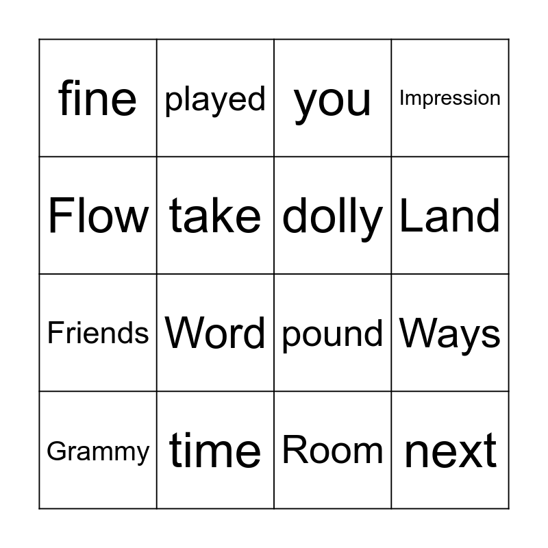 This bingo card has 22 words: time, blinding, played, fire, take, dolly, fine, you, pound, next, Friends, Impression, Sign, Truth, Room, Lovin', Ways, Grammy, Word, Flow, Land and Fly.