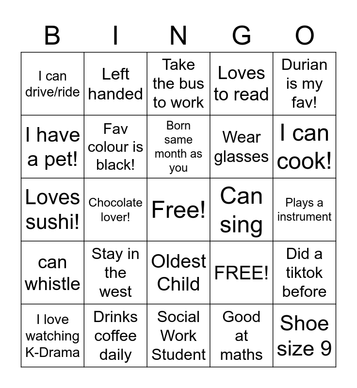 This bingo card has a free space and 25 words: Stay in the west, Social Work Student, Born same month as you, I love watching K-Drama, Durian is my fav!, I can drive/ride, I have a pet!, Left handed, Can sing, Oldest Child, Wear glasses, Loves sushi!, FREE!, Did a tiktok before, Fav colour is black!, Loves spicy food, Plays a instrument, Take the bus to work, I can cook!, Chocolate lover!, Shoe size 9, Drinks coffee daily, can whistle, Loves to read and Good at maths.