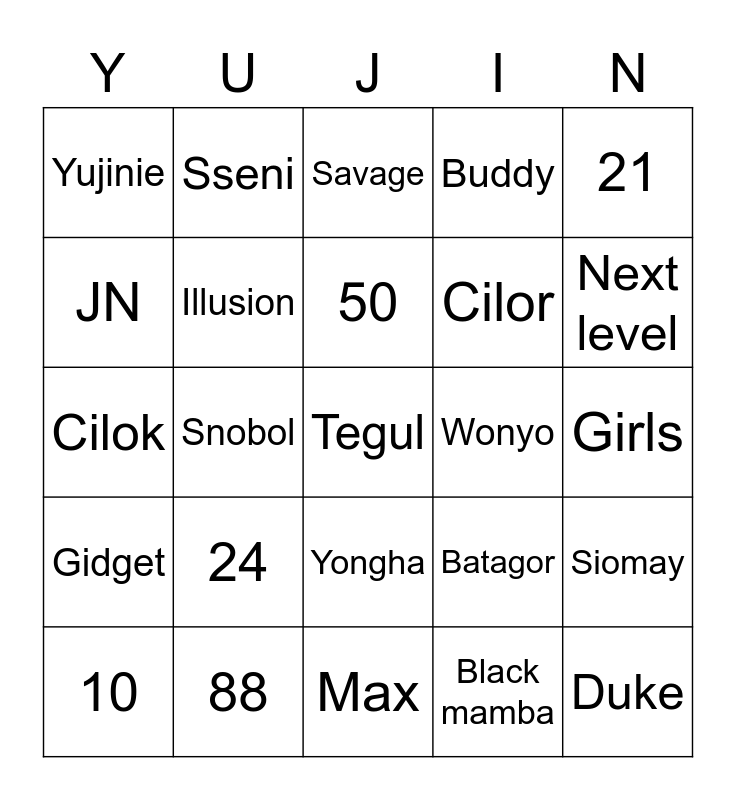 This bingo card has a free space and 24 words: 24, 88, 50, 10, 21, Yujinie, JN, Sseni, Wonyo, Yongha, Cilor, Cilok, Batagor, Siomay, Illusion, Black mamba, Girls, Savage, Next level, Snobol, Duke, Gidget, Buddy and Max.