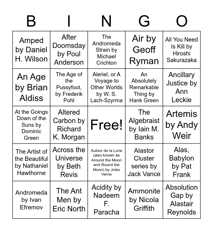 This bingo card has a free space and 51 words: A Beautifully Foolish Endeavor by Hank Green, Absolution Gap by Alastair Reynolds, Accelerando by Charles Stross, Acidity by Nadeem F. Paracha, Across the Universe by Beth Revis, Adulthood Rites, Book Two of Xenogenesis Series by Octavia Butler, After Doomsday by Poul Anderson, Against the Fall of Night, by Arthur C. Clarke, An Age by Brian Aldiss, Age of Miracles (aka The Day of Star Cities, by John Brunner, The Age of the Pussyfoot, by Frederik Pohl, Air by Geoff Ryman, Alas, Babylon by Pat Frank, Alastor Cluster series by Jack Vance, namely, Trullion: Alastor 2262, Marune: Alastor 933, and Wyst: Alastor 1716, The Alejandra Variations by Paul Cook, Aleriel, or A Voyage to Other Worlds by W. S. Lach-Szyrma, The Algebraist by Iain M. Banks, Alien Tongue by Stephen Leigh, essay by Rudy Rucker, All You Need Is Kill by Hiroshi Sakurazaka, Altered Carbon by Richard K. Morgan, Ammonite by Nicola Griffith, Amped by Daniel H. Wilson, An Absolutely Remarkable Thing by Hank Green, Ancient Echoes by Robert Holdstock, Ancient Shores by Jack McDevitt, Ancillary Justice by Ann Leckie, Imperial Radch Series: Ancillary Sword and Ancillary Mercy, Andromeda by Ivan Efremov, The Andromeda Strain by Michael Crichton, Andymon by Angela and Karlheinz Steinmüller, The Angry Espers by Lloyd Biggle, Jr., Anima by Marie Buchanan, Animorphs by K. A. Applegate, Annals of the Twenty-Ninth Century by Andrew Blair, The Ant Men by Eric North, Anthem by Ayn Rand, Anthony Villiers series by Alexei Panshin, namely, Star Well, The Thurb Revolution, and Masque World, Ares Express by Ian McDonald, Artemis by Andy Weir, The Artist of the Beautiful by Nathaniel Hawthorne, As the Green Star Rises by Lin Carter, Asgard series by Brian Stableford, namely, Asgard's Secret, Asgard's Conquerors, and Asgard's Heart, Attack from Atlantis by Lester del Rey, At the Goings Down of the Suns by Dominic Green, Atlas Shrugged by Ayn Rand, The Atrocity Exhibition by J. G. Ballard, Autour de la Lune (also known as Around the Moon and Round the Moon) by Jules Verne and Autumn Angels by Arthur Byron Cover.
