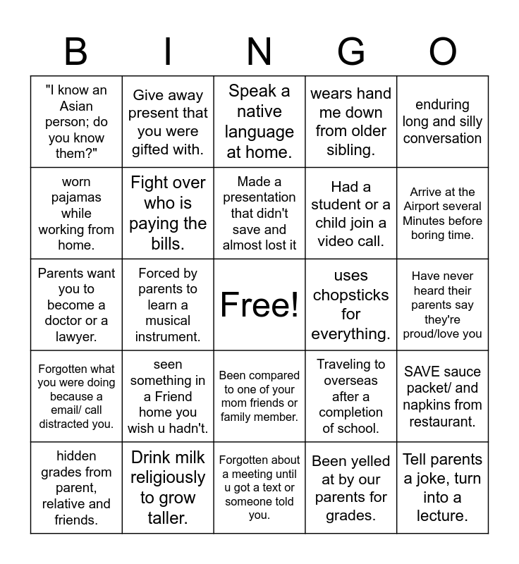 This bingo card has a free space and 25 words: seen something in a Friend home you wish u hadn't., Forgotten about a meeting until u got a text or someone told you., Made a presentation that didn't save and almost lost it, hidden grades from parent, relative and friends., enduring long and silly conversation, "I know an Asian person; do you know them?", worn pajamas while working from home., Give away present that you were gifted with., uses chopsticks for everything., Been compared to one of your mom friends or family member., Had a student or a child join a video call., Parents want you to become a doctor or a lawyer., Traveling to overseas after a completion of school., SAVE sauce packet/ and napkins from restaurant., Fight over who is paying the bills., only Buy things at a discounted shop for your friend or for yourself, Have never heard their parents say they're proud/love you, Speak a native language at home., Arrive at the Airport several Minutes before boring time., Forced by parents to learn a musical instrument., Tell parents a joke, turn into a lecture., Drink milk religiously to grow taller., Forgotten what you were doing because a email/ call distracted you., wears hand me down from older sibling. and Been yelled at by our parents for grades..