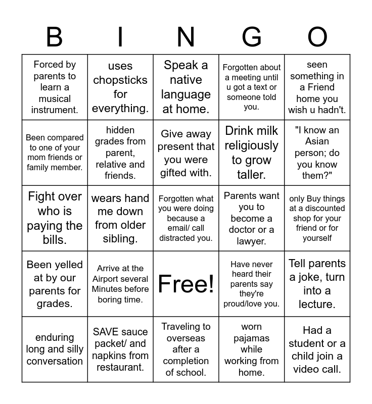 This bingo card has 26 words: Free!, enduring long and silly conversation, hidden grades from parent, relative and friends., Made a presentation that didn't save and almost lost it., Forgotten about a meeting until u got a text or someone told you., seen something in a Friend home you wish u hadn't., Been compared to one of your mom friends or family member., uses chopsticks for everything., Give away present that you were gifted with., worn pajamas while working from home., "I know an Asian person; do you know them?", Fight over who is paying the bills., SAVE sauce packet/ and napkins from restaurant., Traveling to overseas after a completion of school., Parents want you to become a doctor or a lawyer., Had a student or a child join a video call., Forced by parents to learn a musical instrument., Arrive at the Airport several Minutes before boring time., Speak a native language at home., Have never heard their parents say they're proud/love you., only Buy things at a discounted shop for your friend or for yourself, Been yelled at by our parents for grades., wears hand me down from older sibling., Forgotten what you were doing because a email/ call distracted you., Drink milk religiously to grow taller. and Tell parents a joke, turn into a lecture..