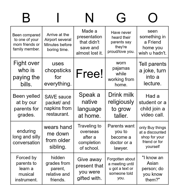 This bingo card has 26 words: enduring long and silly conversation, hidden grades from parent, relative and friends., Free!, Forgotten about a meeting until u got a text or someone told you., seen something in a Friend home you wish u hadn't., Been compared to one of your mom friends or family member., uses chopsticks for everything., Made a presentation that didn't save and almost lost it., worn pajamas while working from home., "I know an Asian person; do you know them?", Fight over who is paying the bills., SAVE sauce packet/ and napkins from restaurant., Give away present that you were gifted with., Parents want you to become a doctor or a lawyer., Had a student or a child join a video call., Forced by parents to learn a musical instrument., Arrive at the Airport several Minutes before boring time., Traveling to overseas after a completion of school., Have never heard their parents say they're proud/love you., only Buy things at a discounted shop for your friend or for yourself, Been yelled at by our parents for grades., wears hand me down from older sibling., Speak a native language at home., Drink milk religiously to grow taller., Tell parents a joke, turn into a lecture. and Forgotten what you were doing because a email/ call distracted you..