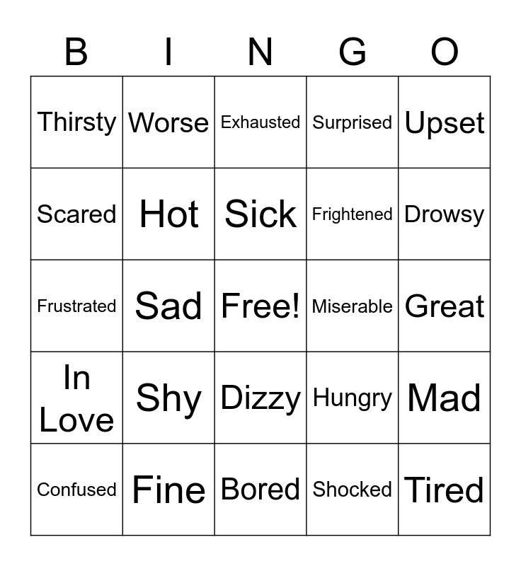 This bingo card has a free space and 32 words: Shocked, Happy, Sad, Angry, In Love, Hot, Upset, Mad, Worse, Terrible, Sick, Exhausted, Better, Cold, Miserable, Excited, Confused, Frustrated, Dizzy, Shy, Hungry, Sleepy, Great, Fine, Tired, Surprised, Frightened, Scared, Thirsty, Bored, Nervous and Drowsy.