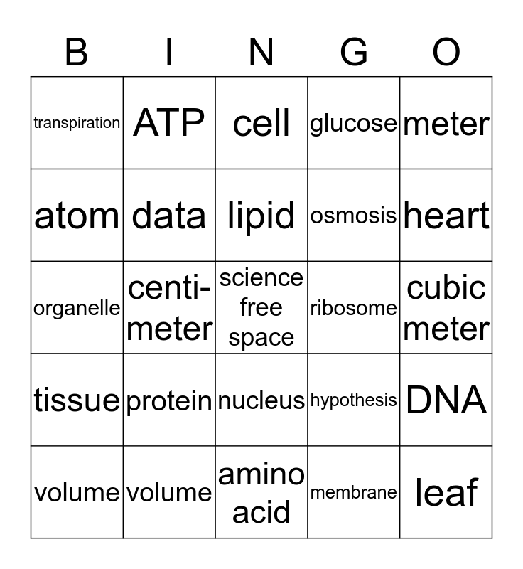This bingo card has a free space and 24 words: protein, volume, lipid, volume, meter, transpiration, atom, ATP, ribosome, nucleus, osmosis, organelle, hypothesis, DNA, data, membrane, cubic meter, cell, heart, centi- meter, leaf, tissue, glucose and amino acid.