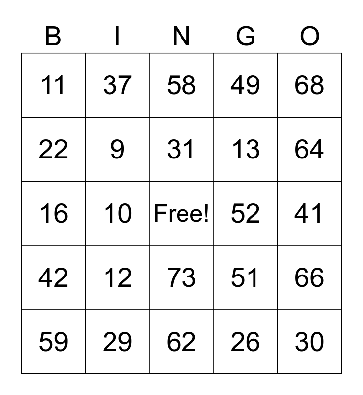 This bingo card has a free space and 24 words: 12, 29, 31, 59, 68, 11, 22, 37, 52, 73, 13, 16, 51, 66, 9, 26, 41, 58, 64, 10, 30, 42, 49 and 62.