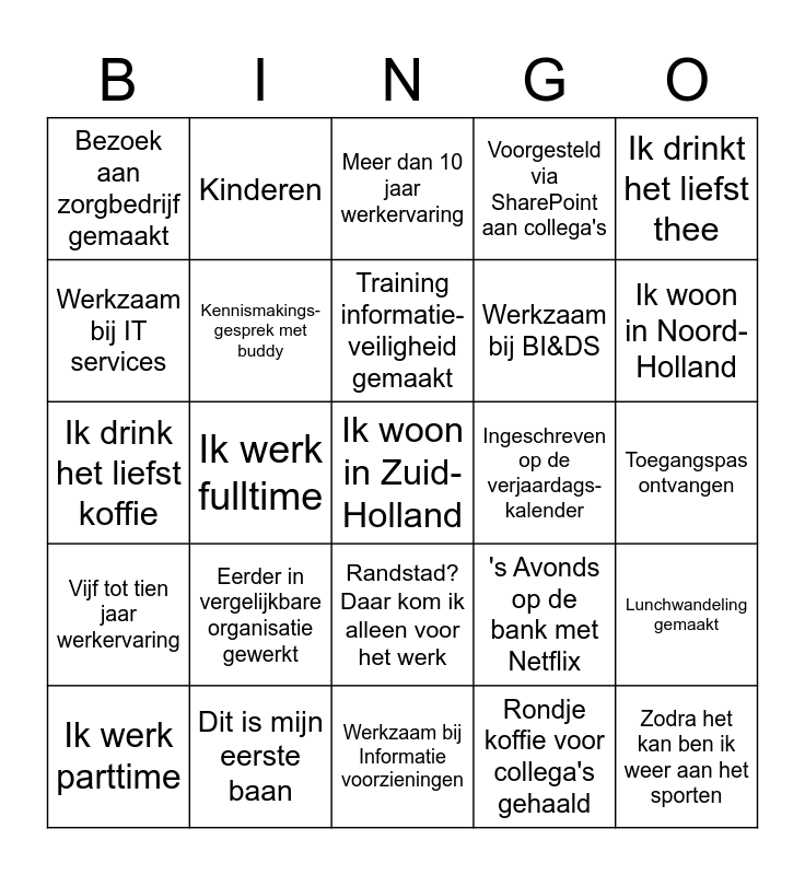 This bingo card has a free space and 24 words: Eerder in vergelijkbare organisatie gewerkt, Dit is mijn eerste baan, Training informatie-veiligheid gemaakt, Ik werk parttime, Ik drinkt het liefst thee, Bezoek aan zorgbedrijf gemaakt, Werkzaam bij IT services, Kinderen, Ingeschreven op de verjaardags-kalender, Randstad? Daar kom ik alleen voor het werk, Werkzaam bij BI&DS, Ik drink het liefst koffie, 's Avonds op de bank met Netflix, Lunchwandeling gemaakt, Kennismakings-gesprek met buddy, Rondje koffie voor collega's gehaald, Toegangspas ontvangen, Meer dan 10 jaar werkervaring, Ik woon in Noord-Holland, Ik werk fulltime, Zodra het kan ben ik weer aan het sporten, Vijf tot tien jaar werkervaring, Voorgesteld via SharePoint aan collega's and Werkzaam bij Informatie voorzieningen.