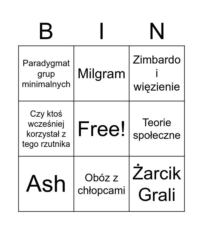 This bingo card has a free space and 8 words: Teorie społeczne, Zimbardo i więzienie, Milgram, Ash, Paradygmat grup minimalnych, Żarcik Grali, Czy ktoś wcześniej korzystał z tego rzutnika and Obóz z chłopcami.