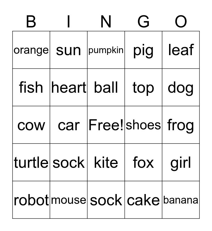 This bingo card has a free space and 24 words: sock, mouse, ball, robot, leaf, orange, fish, sun, shoes, kite, top, cow, fox, girl, heart, cake, frog, pumpkin, dog, car, banana, turtle, pig and sock.