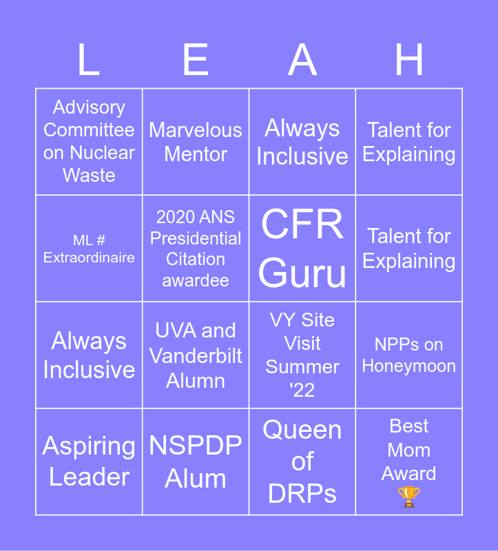 ⚠ This card has duplicate items: VY Site Visit Summer '22 (2), NPPs on Honeymoon (2), Inspector Qualified (2), Best Mom Award 🏆 (2), CFR Guru (2), ML # Extraordinaire (2), Queen of DRPs (2), Marvelous Mentor (2), Aspiring Leader (2), Talent for Explaining (2), Always Inclusive (2), 2020 ANS Presidential Citation awardee (2), Advisory Committee on Nuclear Waste (2), NSPDP Alum (2), Just a Teams call away! (2)