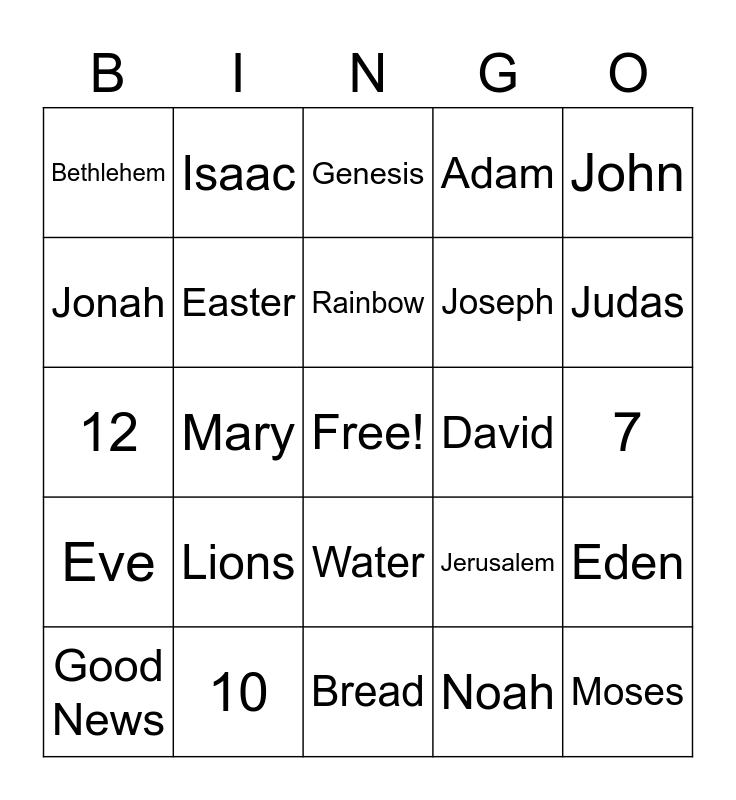 This bingo card has a free space and 25 words: Lions, Bread, Rainbow, Good News, John, Bethlehem, Jonah, Isaac, David, Water, Joseph, 12, Jerusalem, Eden, Easter, 2, 7, Genesis, Judas, Mary, Moses, 10, Eve, Adam and Noah.