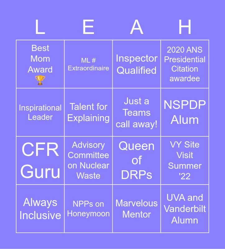 This bingo card has 16 words: NPPs on Honeymoon, VY Site Visit Summer '22, Inspector Qualified, Best Mom Award 🏆, CFR Guru, ML # Extraordinaire, Queen of DRPs, Marvelous Mentor, Inspirational Leader, Talent for Explaining, Always Inclusive, 2020 ANS Presidential Citation awardee, Advisory Committee on Nuclear Waste, NSPDP Alum, Just a Teams call away! and UVA and Vanderbilt Alumn.
