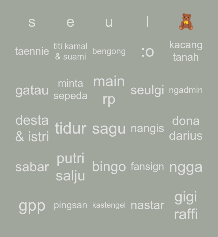 This bingo card has a free space and 24 words: putri salju, pingsan, main rp, gpp, kacang tanah, taennie, gatau, titi kamal & suami, nangis, bingo, seulgi, desta & istri, fansign, ngga, minta sepeda, nastar, dona darius, bengong, ngadmin, tidur, gigi raffi, sabar, :o and kastengel.