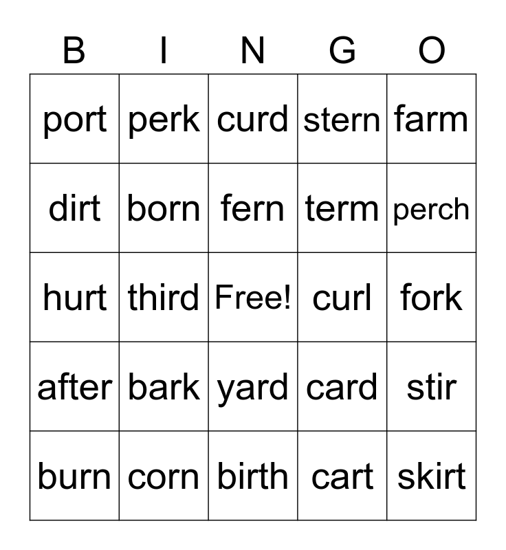 This bingo card has a free space and 24 words: bark, corn, fern, burn, farm, port, dirt, perk, curl, yard, term, hurt, card, stir, born, cart, fork, curd, perch, third, skirt, after, stern and birth.