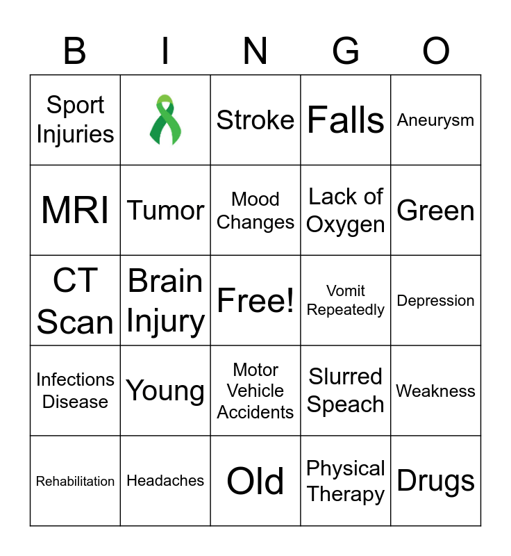 This bingo card has 2 images, a free space and 33 words: memory loss, March, Brain Bleed, Tumor, Motor Vehicle Accidents, Falls, MRI, If you are wearing green, Mood Changes, Anyone, CT Scan, Aneurysm, Near Drowning, Numbness, Sport Injuries, Vomit Repeatedly, Physical Therapy, Brain Injury, Infections Disease, Drugs, Slurred Speach, Rehabilitation, Weakness, Headaches, Stroke, Green, Seizures, TBI, Lack of Oxygen, Depression, Assaults, Old and Young.