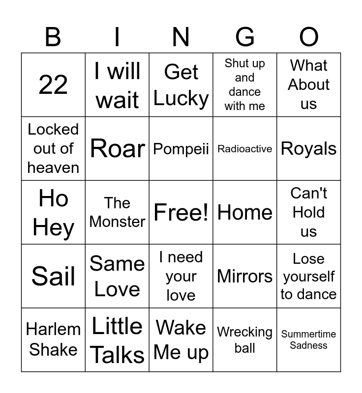 This bingo card has a free space and 27 words: Mirrors, Blurred Lines, Radioactive, Wake Me up, Locked out of heaven, Get Lucky, I will wait, Sail, Home, Lose yourself to dance, Ho Hey, Shut up and dance with me, Harlem Shake, Little Talks, Royals, Sure be cool if you did, Roar, Pompeii, Same Love, 22, Can't Hold us, Wrecking ball, The Monster, Summertime Sadness, I need your love, What About us and Airplanes.