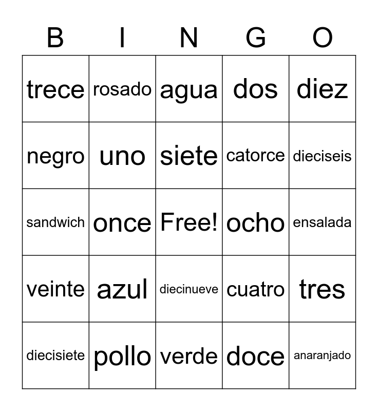 This bingo card has a free space and 46 words: rojo, anaranjado, amarillo, verde, azul, morado, rosado, blanco, negro, gris, uno, dos, tres, cuatro, cinco, seis, siete, ocho, nueve, diez, once, doce, trece, catorce, quince, dieciseis, diecisiete, dieciocho, diecinueve, veinte, queso, leche, papa, pan, jugo, pollo, ensalada, fruta, vegetales, naranja, sopa, agua, sandwich, manzana, carne and platano.