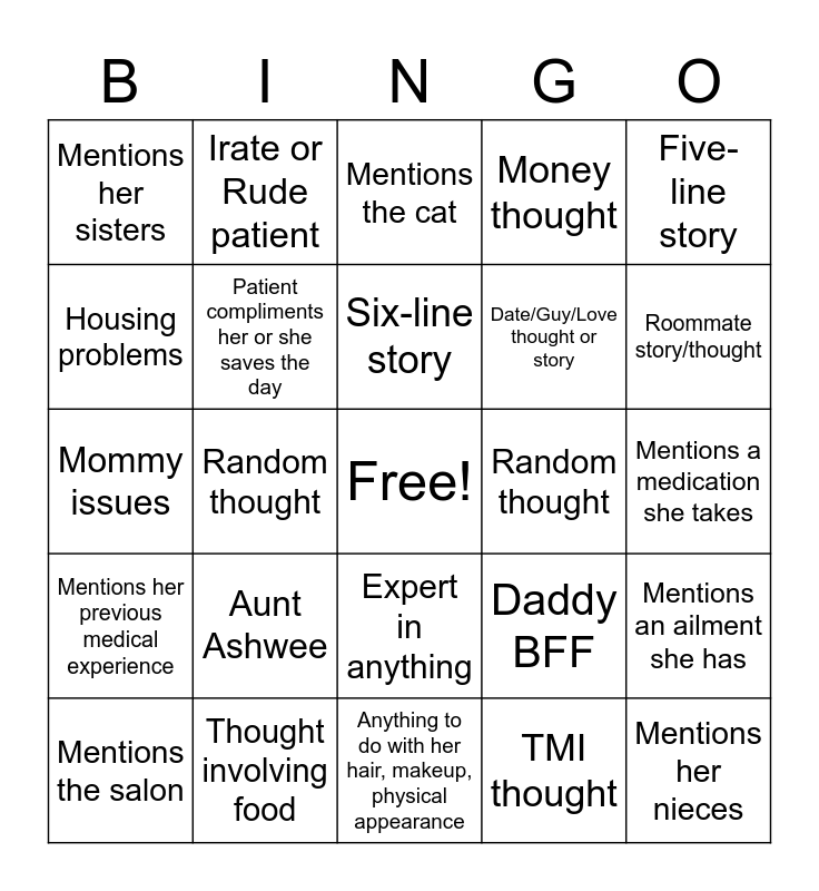 This bingo card has a free space and 24 words: Aunt Ashwee, Thought involving food, Six-line story, Mentions the salon, Five-line story, Mentions her sisters, Housing problems, Irate or Rude patient, Random thought, Expert in anything, Date/Guy/Love thought or story, Mommy issues, Daddy BFF, Mentions an ailment she has, Patient compliments her or she saves the day, TMI thought, Mentions a medication she takes, Mentions the cat, Roommate story/thought, Random thought, Mentions her nieces, Mentions her previous medical experience, Money thought and Anything to do with her hair, makeup, physical appearance.