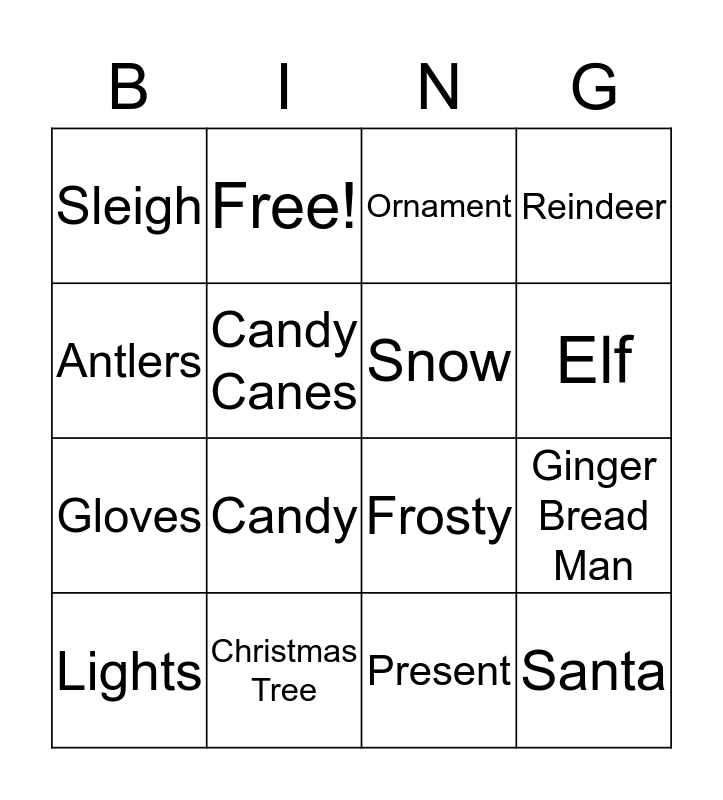 This bingo card has 16 words: Christmas Tree, Ginger Bread Man, Ornament, Sleigh, Gloves, Free!, Frosty, Present, Antlers, Candy Canes, Lights, Reindeer, Candy, Elf, Snow and Santa.