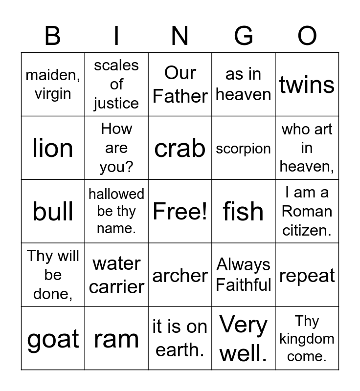 This bingo card has a free space and 24 words: water carrier, ram, crab, goat, twins, maiden, virgin, lion, scales of justice, fish, archer, scorpion, bull, Always Faithful, repeat, How are you?, Very well., I am a Roman citizen., Our Father, who art in heaven,, hallowed be thy name., Thy kingdom come., Thy will be done,, as in heaven and it is on earth..