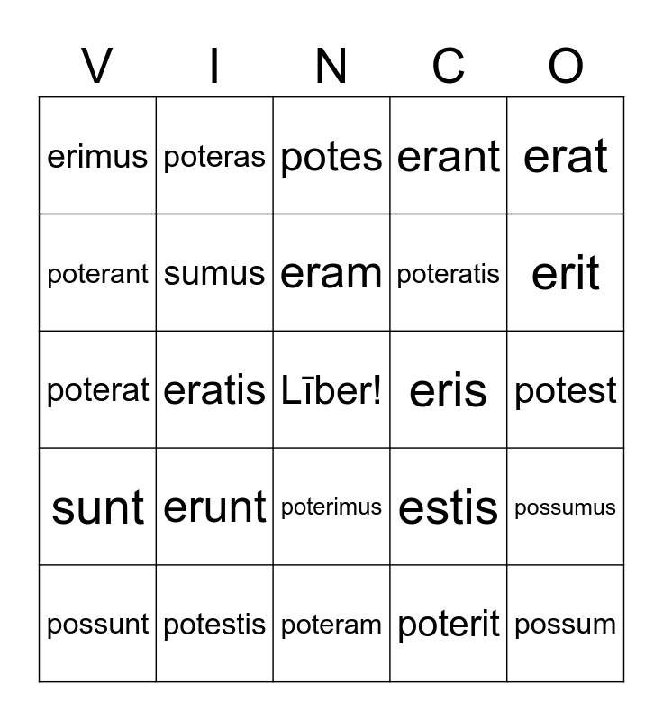 This bingo card has a free space and 36 words: sum, es, est, sumus, estis, sunt, eram, eras, erat, eramus, eratis, erant, erō, eris, erit, erimus, eritis, erunt, possum, potes, potest, possumus, potestis, possunt, poteram, poteras, poterat, poteramus, poteratis, poterant, poterō, poteris, poterit, poterimus, poteritis and poterunt.