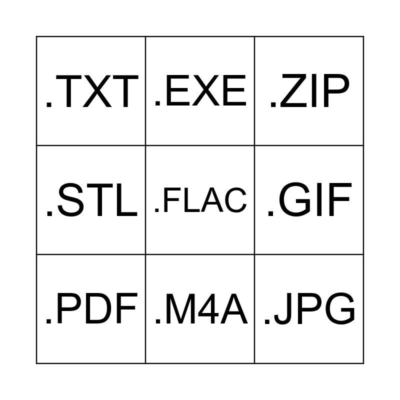 This bingo card has a free space and 8 words: .GIF, .ZIP, .EXE, .PDF, .TXT, .JPG, .STL and .M4A.
